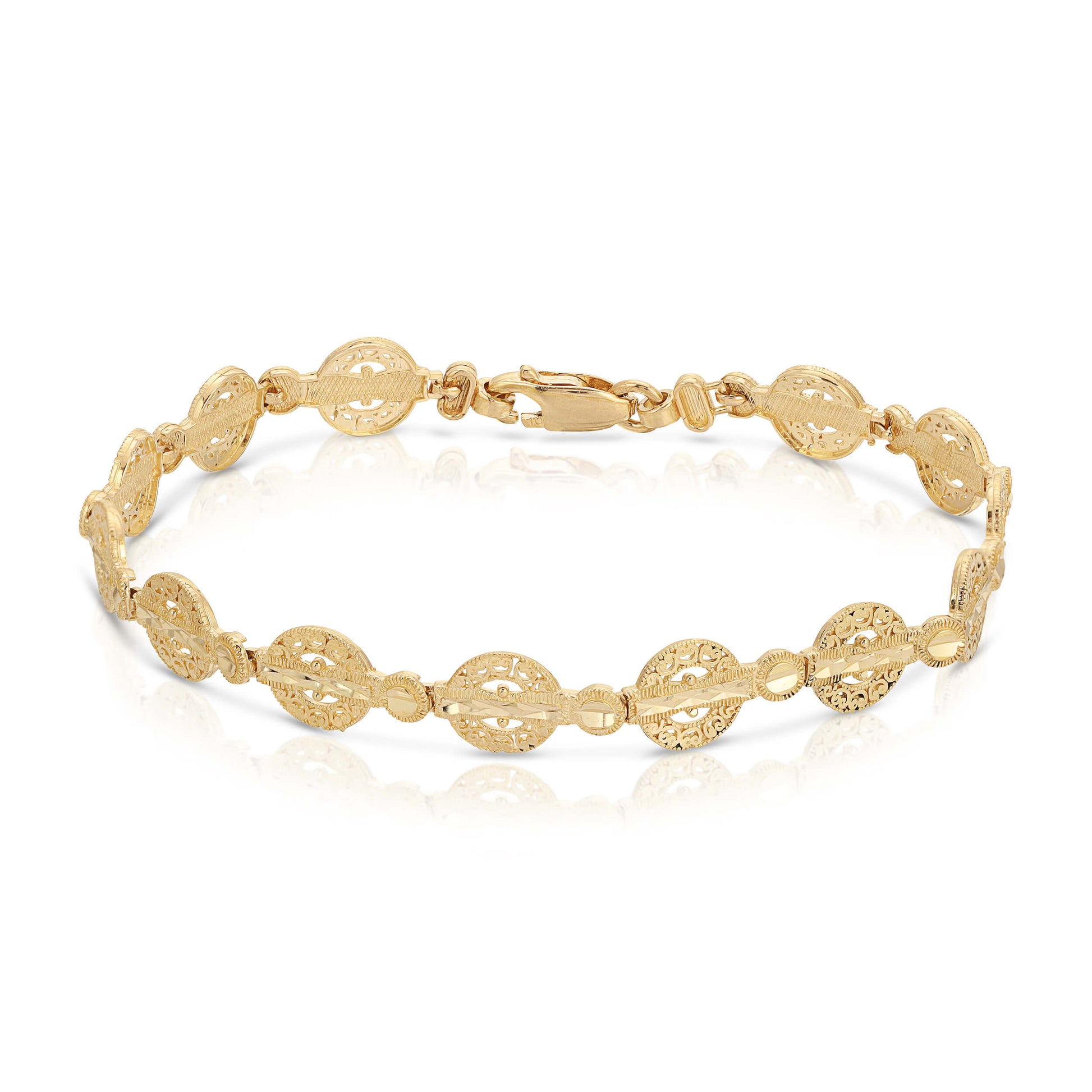 Embrace old-world elegance with this exquisite bracelet, featuring open circle links adorned with intricate textured detailing. Perfect for those who appreciate vintage charm with a modern twist.