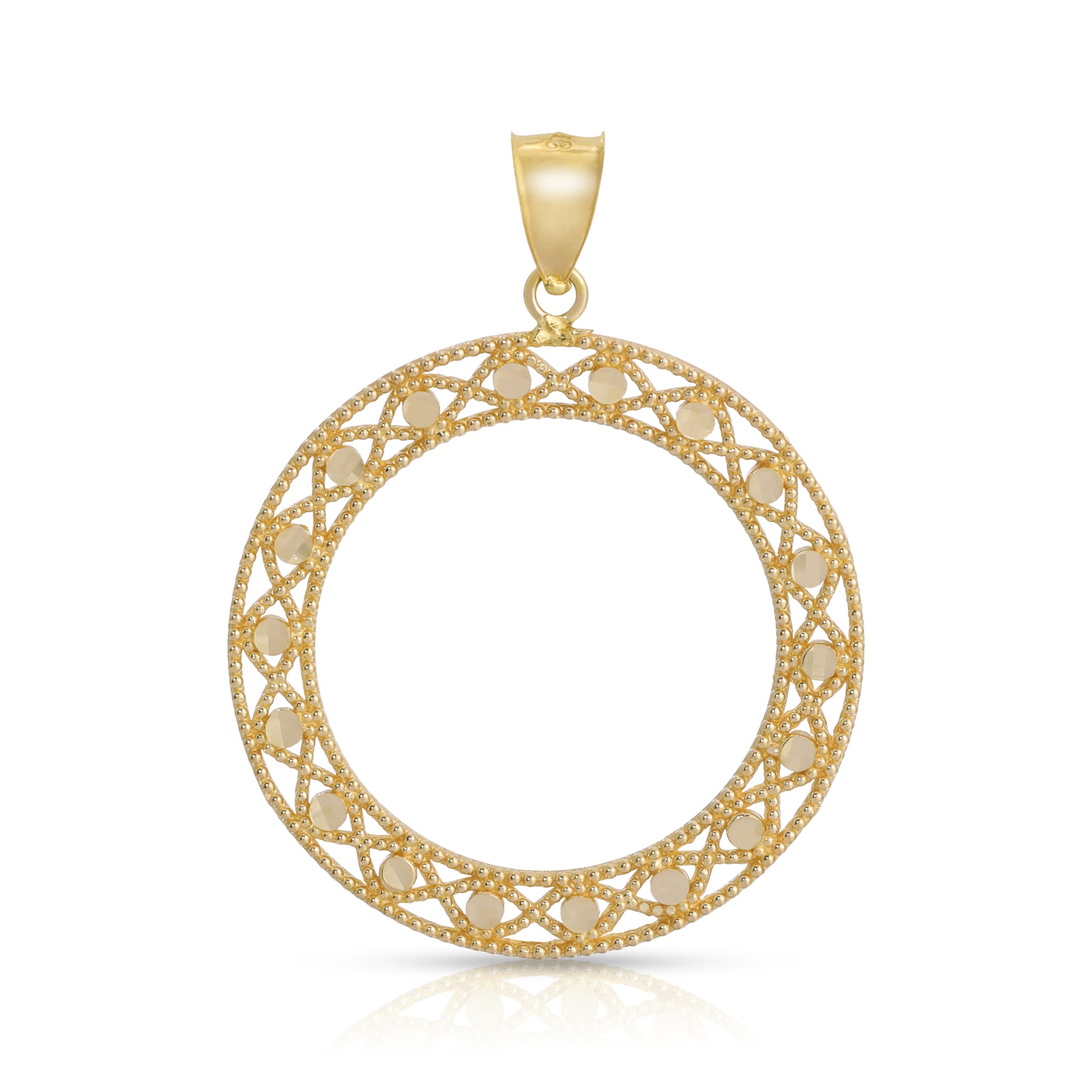 This pendant features a sleek open circle design, symbolizing wholeness and infinite connection. The patterned border adds a touch of intricate detail, enhancing its sophisticated appeal.