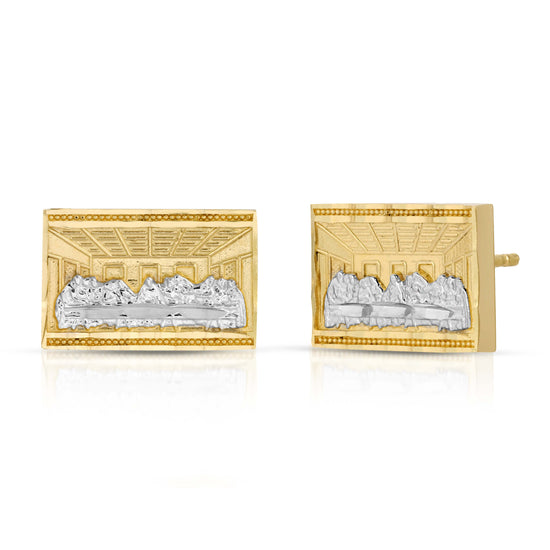 These stunning rectangular stud earrings beautifully depict the iconic Last Supper, crafted with a striking two-tone design that enhances every intricate detail. A meaningful expression of faith and artistry, these earrings are a timeless addition to any jewelry collection, perfect for those who appreciate both spiritual symbolism and exquisite craftsmanship.