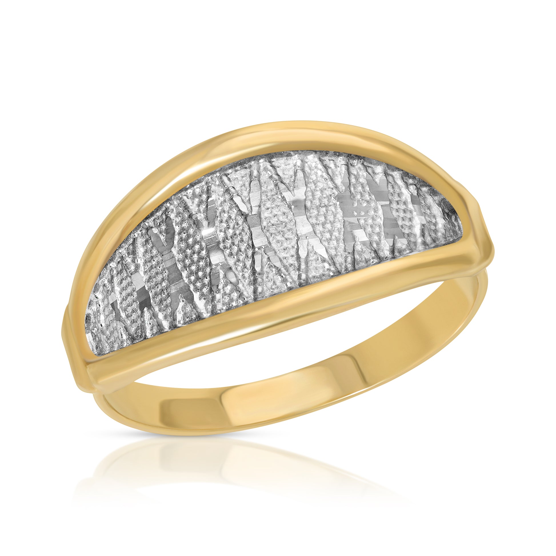 This striking ring features a rounded marquise shape, beautifully crafted to resemble a protective shield. At its core, a textured white gold center adds depth and dimension, creating a captivating contrast against the warm glow of the surrounding yellow gold band.