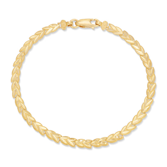 This bracelet features wheat-shaped textured links that create a timeless and refined look. The delicate detailing enhances the bracelet’s depth and dimension