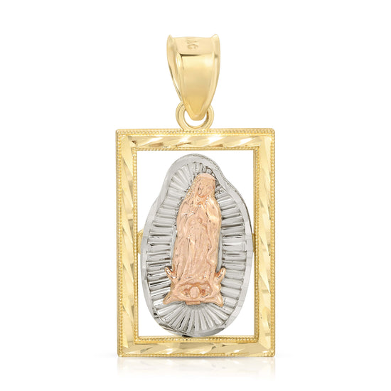 Graceful and symbolic, this tricolor Mary pendant is a stunning expression of faith and devotion. Featuring a beautifully detailed depiction of Mary in radiant three-tone gold, the design blends warm rose, classic yellow, and elegant white gold for a striking contrast.